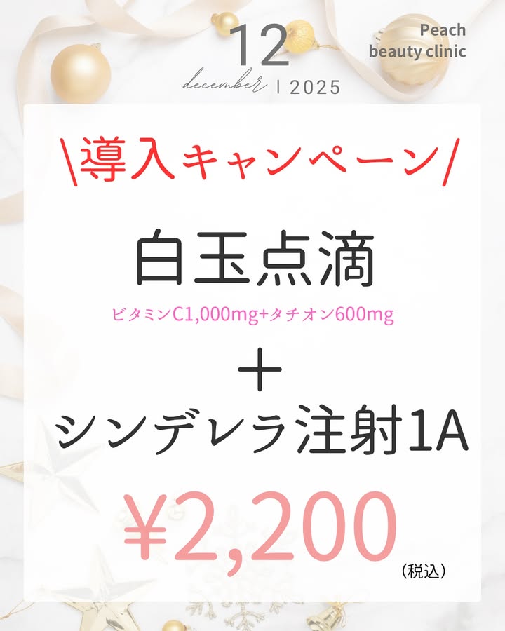 【12月】限定 導入キャンペーン|peach美容クリニック おススメ施術 2025.12.05 peach美容クリニックです。 いつもご利用いただきありがとうございます。 ✨12月限定 導入キャンペーン✨ 【白玉点滴+シンデレラ注射1A】 💎ビタミンC 1,000mg+タチオン600mg配合 透明感&エイジングケアを同時に叶える人気の組み合わせです😊 特別価格 ▶︎ ¥2,200(税込) この機会にぜひお試しください💉 ご予約はお早めにどうぞ📲 ―――― #小倉美容 #白玉点滴 #シンデレラ注射 #美容点滴 #美白ケア #透明感アップ #美肌習慣 #疲労回復 #エイジングケア #美容好きな人と繋がりたい #美容クリニック #peach美容クリニック