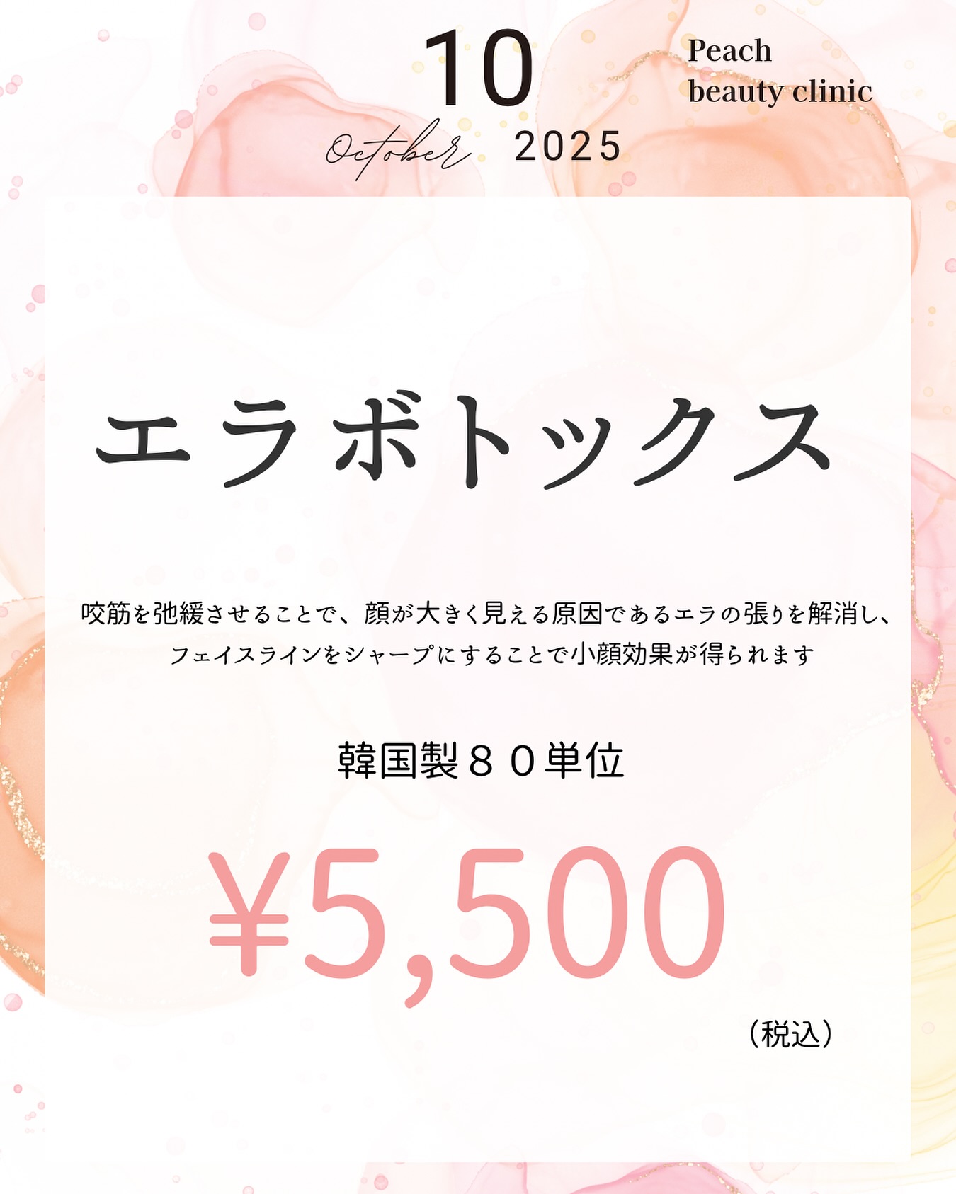 【10月】エラボトックス|peach美容クリニック FACE 2025.10.05 peach美容クリニックです。 いつもご利用いただきありがとうございます。 💉エラボトックス💉 気になるエラの張りを和らげて、フェイスラインをスッキリ✨ 咬筋をリラックスさせることで小顔効果も期待できます。 【10.限定価格】 エラボトックス ¥5,500(税込) 気になる方はぜひこの機会にお試しください☺️ #小顔 #エラボトックス #ボトックス #フェイスライン #小顔効果 #美容クリニック #peach美容クリニック #小倉美容