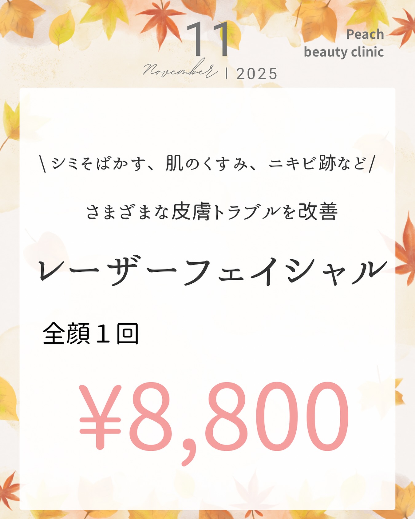 【11月】レーザーフェイシャル|peach美容クリニック おススメ施術 2025.11.06 peach美容クリニックです。 いつもご利用いただきありがとうございます。 💎レーザーフェイシャル💎 シミ・そばかす、肌のくすみ、ニキビ跡など さまざまなお悩みにアプローチ✨ 透明感のあるツヤ肌へ導きます🌿 📍全顔1回 ¥8,800 気になる方はぜひ一度お試しください☺️ ⸻ 🔖ハッシュタグ #小倉美容 #美容クリニック #レーザーフェイシャル #美肌ケア #シミそばかす #くすみ改善 #ニキビ跡改善 #美肌になりたい #透明感肌 #艶肌 #肌質改善 #福岡美容