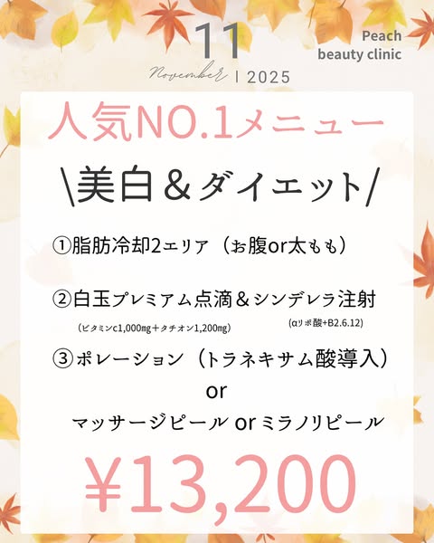 #小倉美容 #小倉駅近く #美白ケア #脂肪冷却 #ダイエットメニュー #白玉点滴 #シンデレラ注射 #ポレーション #マッサージピール #ミラノリピール #美容好きな人と繋がりたい #肌改善 #美肌ケア #peach美容クリニック